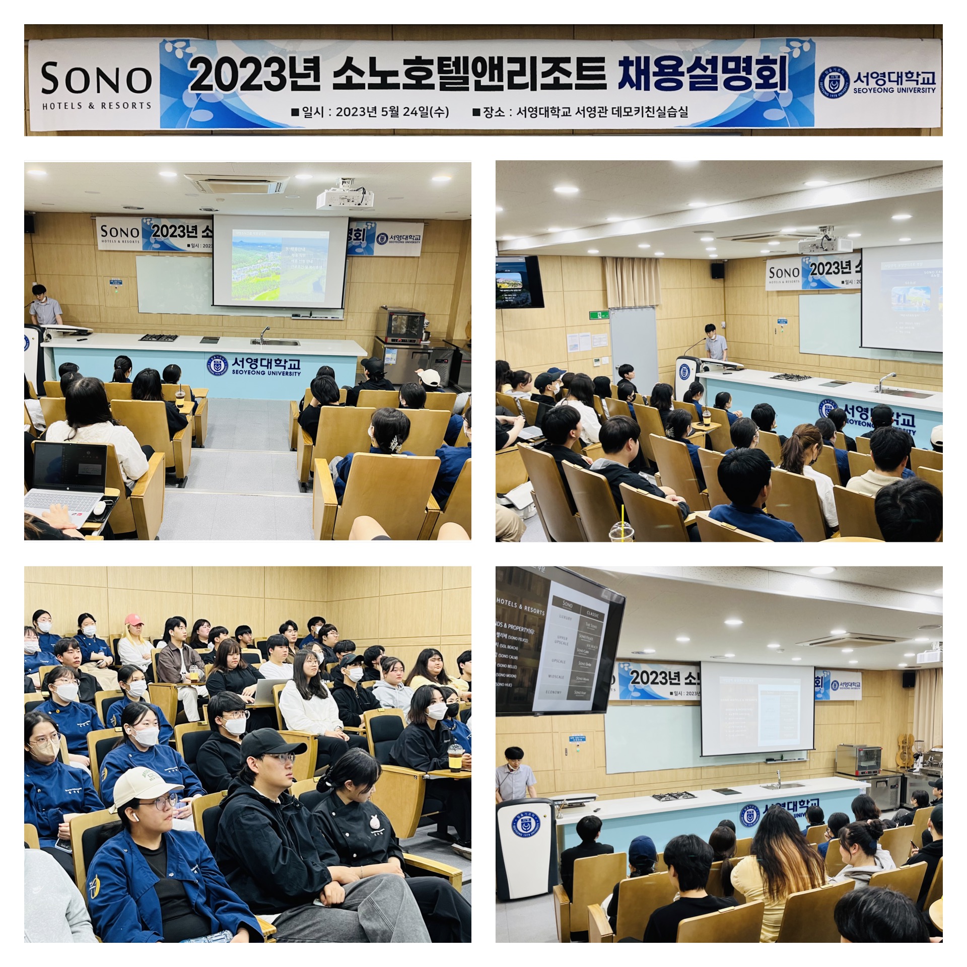 ○ 소노호텔앤리조트 채용설명회를 24일 교내 서영관 데모키친실습실에서 1,2학년 재학생 대상으로 진행되었다.