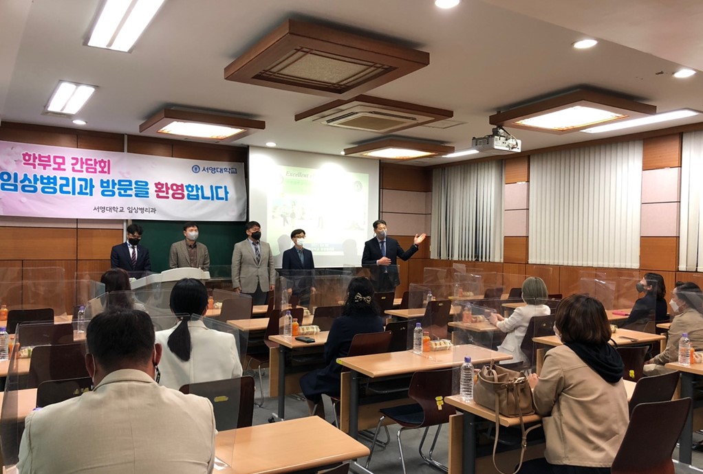 서영대학교 임상병리과에서는 2021학년도 학부모님을 초청하여 학과소개 및 향후 면허취득과 취업을 위한 학과의 노력에 대해 학부모님과 소통의 시간을 마련하였습니다. 늦은 시간에도 불구하고 학과장(조영국교수)을 비롯한 소속교수님들과 3학년 학부모님 20여분이 함께 학생들의 면허취득과 취업에 대한 다양한 정보와 4학년 전공심화 학사과정에 대한 높은 관심속에서 1시간이 넘는 열띤토론의 시간을 가졌습니다. 이자리에서 2021학년도 3학년 지도를 맡은 조영국교수님은 3학년 학생들의 면허취득을 위한 학습활동의 필요성과 이를 위한 지원노력 그리고 질높은 취업을 위해 가정과 학교의 공동노력을 제안하였으며, 광주전남에서 취업명문학과로서의 위상을 높이기 위해 최선을 다하겠다는 포부를 밝혔습니다. 참석하신 학부모님들은 지도교수님 발표이후 많은 질문을 통해 학생취업 및 면허취득관리의 노력을 확인하시고 뜨거운 박수 갈채를 보내주셨습니다. 간담회 참석하신 어머님께 참석소해를 묻는 질문에는 "대학과 학과교수님들의 노력에 큰 박수를 보내며 굉장히 유익하고 의미있는 시간이였으며, 대학에서 이러한 학부모들과 함께 우리애들을 위해 최선을 다해주고 계시는 것이 너무나도 마음든든하고 감사드리며 이러한 임상병리과 교수님 열정에 정말 감동받았다" 라는 말씀을 전하셨습니다. 다시한번 코로나 상황에서도 3학년 학생들의 면허취득과 학생관리를 위해 최선의 노력을 다하시는 교수님들을 격려를 위해 바쁘신 시간속에서도 참석해주신 임상병리과 3학년 학부모님들께 다시한번 깊은 감사의 말씀을 전합니다. - 서영대학교 임상병리과 화이팅!!!