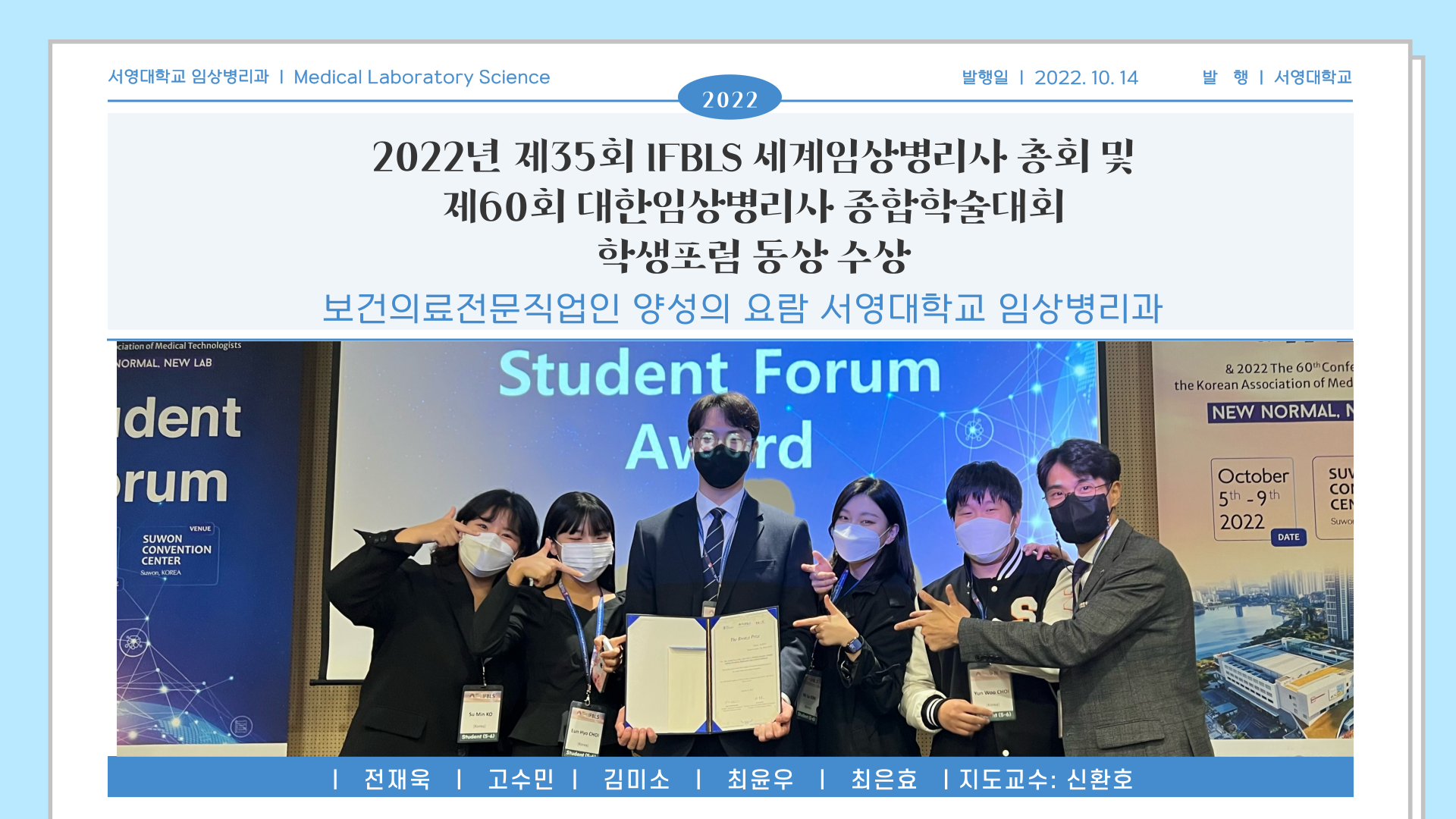 서영대학교 임상병리과는 2022105~9일동안 수원 컨벤션센터에서 개최된 60회 대한임상병리사 종합학술대회, 35회 세계임상병리사연맹(International Federation of Biomedical Laboratory Science, 이하 IFBLS)’ 2022년 학생포럼에서 동상을 수상하였습니다. 학생포럼은 대한임상병리사협회가 주관하여 전국 55개 대학을 대상으로 치열한 예선심사를 통해 그 중 10개 대학만이 본선에 진출하여 ‘Future competence an metaverse of clinical laboratory scientists in the new normal era’ 주제로 우리대학은 2학년 전재욱, 고수민, 김미소, 최윤우, 최은효 학생들은 신환호 교수의 지도하에 참가하여 국내 및 해외 학생들과 경쟁하여 동상이라는 큰 상을 수상하였습니다.!