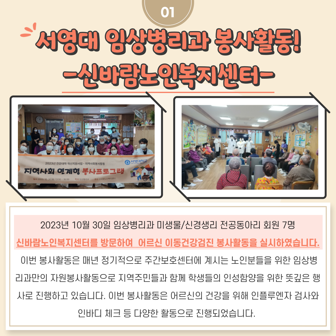 2023년 10월 30일 임상병리과 미생물/신경생리 전공동아리 회원 7명의 학생들이 신바람노인복지센터를 방문하여 어르신 이동건강검진 봉사활동을 실시하였습니다. 이번 봉사활동은 매년 정기적으로 주간보호센터에 계시는 노인분들을 위한 임상병리과만의 자원봉사활동으로 지역주민들과 함께 학생들의 인성함양을 위한 뜻깊은 행사로 진행하고 있습니다. 이번 봉사활동은 어르신의 건강을 위해 인플루엔자 검사와 인바디 체크 등 다양한 활동으로 진행되었습니다.