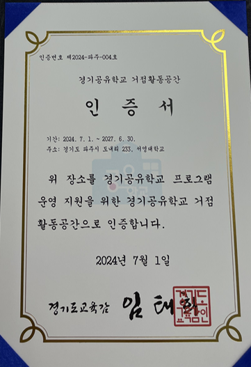 O. 우리대학(총장 김정수)과 파주교육지원청(교육장 최은미)은 상호 존중과 신뢰를 바탕으로 경기공유학교 거점활동공간 사용을 합의하였다. 이번 합의와 함께 우리대학은 경기공유학교 프로그램의 안정적 학습 지원을 위한 경기공유학교 거점 활동공간으로 인증(기간 : 2024.07.01 ~ 2027.06.30.)을 받았다.